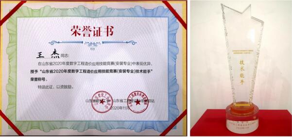 11月14日, 2020年度全省數字工程造價應用技能競賽(安裝專業)決賽在濟南舉行。集團職工王杰取得了山東省第三、青島市第一的優異成績,榮獲“山東省2020年度數字工程造價應用技能競賽(安裝專業)技術能手”榮譽稱號。