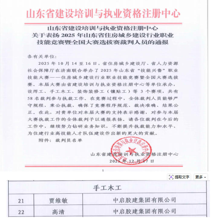 近日,山東省建設培訓與執(zhí)業(yè)資格注冊中心發(fā)布通報,對參與2025年山東省“技能興魯”職業(yè)技能大賽——住房城鄉(xiāng)建設行業(yè)職業(yè)技能競賽暨全國大賽選拔賽的裁判人員予以通報表揚。集團職工賈維敏、高清名列其中,展現(xiàn)了集團職工精湛的專業(yè)素養(yǎng)和公正嚴謹?shù)膱?zhí)裁風采。