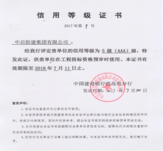近日,中啟膠建集團有限公司順利通過中國建設銀行信用等級AAA復評工作,此次復評主要考核企業在銀行的信譽情況。