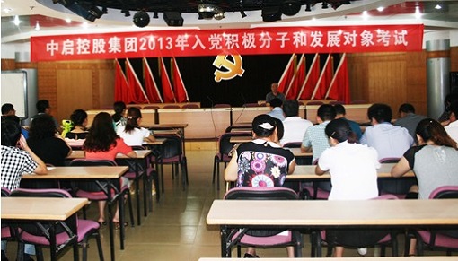 2013年7月6日上午8點30分,中啟控股集團黨委組織30多名入黨積極分子和發展對象在集團二樓多功能廳進行黨建知識考試,集團黨委邢吉忠副書記到考場監督考試。
