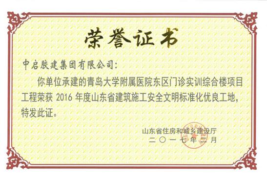 青醫附院東區門診實訓樓項目是中啟膠建集團建筑七公司施工的一項省、市重點工程。該項目開工以來,克服施工現場狹窄、施工工期緊、施工工程量大等重重困難,優質、快速的完成既定任務。期間榮獲了青島市優質工程、山東省優質結構、青島市綜合管理清單樣板工程、山東省安全文明工地、山東省綠色科技示范工程等多項榮譽,并成功舉辦了“青島市建筑工程質量提升行動作為示范工程”觀摩會一項。