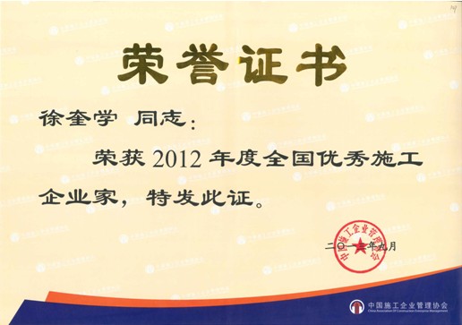 12月3日,由中國施工企業管理協會主辦的“2013年全國施工企業領軍人物峰會”在北京隆重舉行,公司總經理徐奎學榮獲“2012年度全國優秀施工企業家”稱號。
