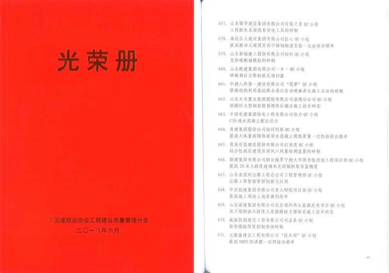 其中,7月1日,在中國建筑業協會組織的全國QC發布活動中,本成果以青島市第二名的排名在交流會上交流發布。本次中國建筑業協會QC交流活動不發證書,以光榮冊的形式下發獲獎成果。