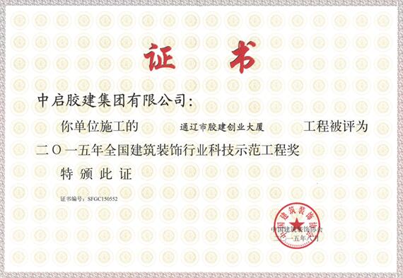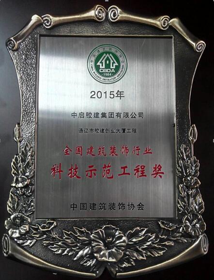 建筑六公司施工的通遼市膠建創業大廈裝飾工程,榮獲2015年全國建筑裝飾行業科技示范工程獎,這是我公司首次榮獲此殊榮。