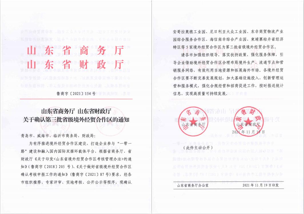 2021年11月19日,根據(jù)《山東省商務(wù)廳、山東省財(cái)政廳關(guān)于確認(rèn)第三批省級境外經(jīng)貿(mào)合作區(qū)的通知》(魯商字﹝2021﹞154號),柬埔寨桔井省經(jīng)濟(jì)特區(qū)確認(rèn)為第三批省級境外經(jīng)貿(mào)合作區(qū)。