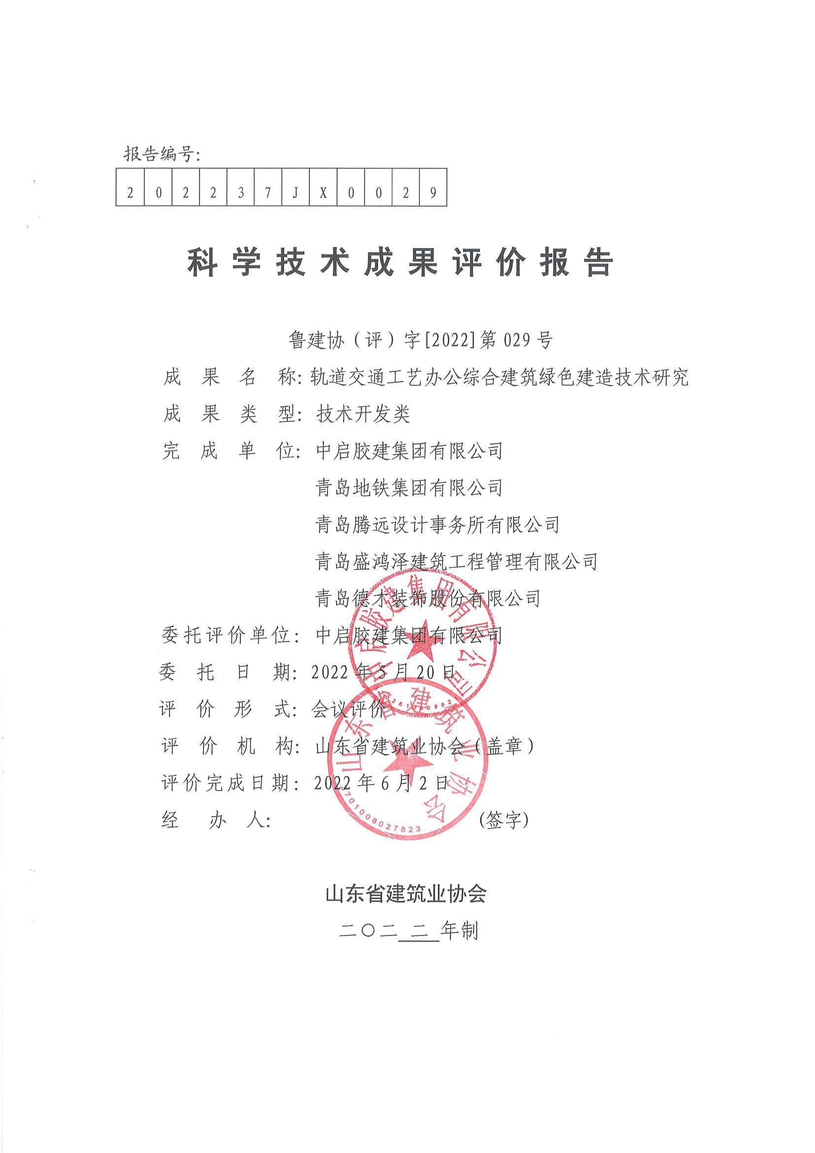 2022年6月,中啟膠建集團(tuán)膠州公司完成的《軌道交通工藝辦公綜合綠色施工技術(shù)應(yīng)用研究》成果順利通過(guò)山東省建筑業(yè)科學(xué)技術(shù)成果評(píng)價(jià),技術(shù)成果水平達(dá)到國(guó)內(nèi)領(lǐng)先水平。