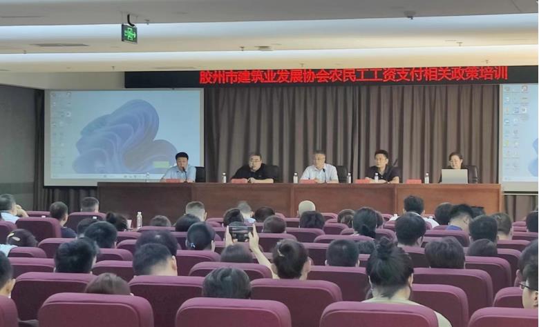 為進(jìn)一步加強(qiáng)建筑工程項(xiàng)目管理,規(guī)范現(xiàn)場(chǎng)勞務(wù)用工管理,深入了解《保障農(nóng)民工工資支付條例》等法律法規(guī),引導(dǎo)企業(yè)加強(qiáng)勞動(dòng)用工管理,規(guī)范工資支付行為,確保工程建設(shè)安全有序推進(jìn)。2023年7月6日上午,膠州市建筑業(yè)發(fā)展協(xié)會(huì)在澄韻中心順利舉行保障農(nóng)民工工資支付方面的相關(guān)政策培訓(xùn)。膠州市住建局副局長(zhǎng)宋世謙和膠州市人社局勞動(dòng)關(guān)系協(xié)調(diào)中心主任李臻出席了本次培訓(xùn)并講話,參加培訓(xùn)的有會(huì)員單位負(fù)責(zé)人及勞務(wù)工作人員共200多人。培訓(xùn)由協(xié)會(huì)秘書(shū)長(zhǎng)劉堯主持。