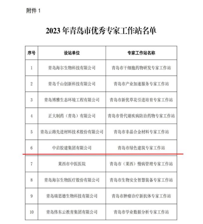 日前,在青島市人力資源和社會(huì)保障局組織的2023年青島市優(yōu)秀專(zhuān)家工作站評(píng)選中,中啟膠建集團(tuán)有限公司的“綠色建筑專(zhuān)家工作站”,被評(píng)為2023年青島市優(yōu)秀專(zhuān)家工作站。