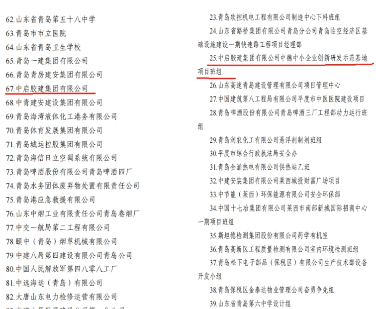 近日,青島市總工會、青島市應急管理局、青島市衛生健康委員會聯合公布了2022-2023年度全市“安康杯”競賽獲獎名單,中啟膠建集團有限公司獲評青島市“安康杯”競賽優勝單位,中德中小企業創新研發示范基地項目班組獲評青島市“安康杯”競賽優勝班組。