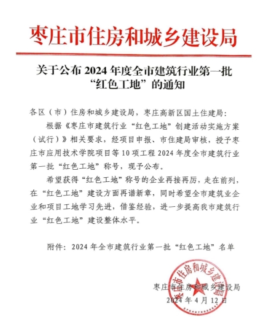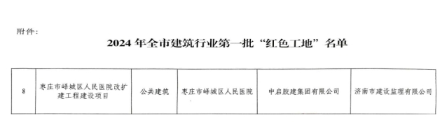 近日,棗莊市住房和城鄉建設局公布了2024年全市建筑行業第一批“紅色工地”名單,由公司承建的棗莊市嶧城區人民醫院改擴建工程建設項目榮獲2024年度棗莊市建筑行業第一批“紅色工地”稱號。