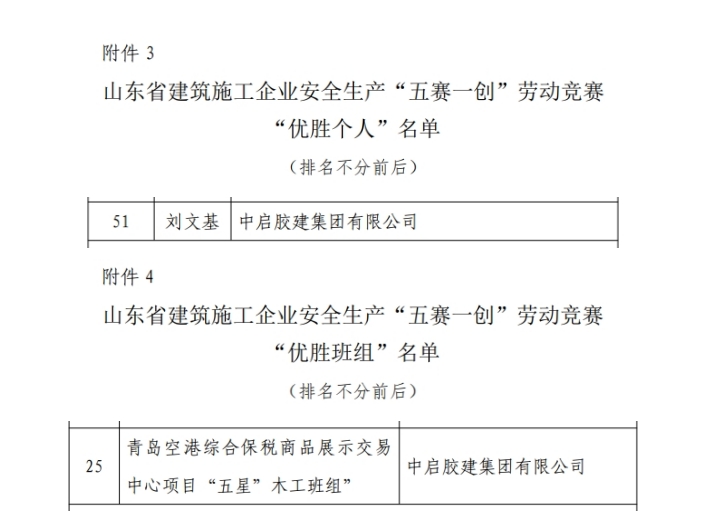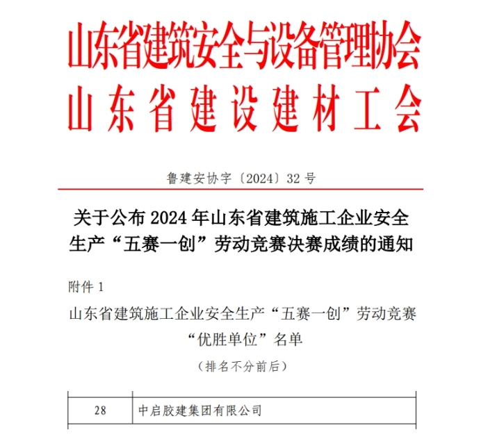 近日,2024年山東省建筑施工企業(yè)安全生產(chǎn)“五賽一創(chuàng)”勞動競賽活動圓滿落幕。其中,中啟膠建集團有限公司被評選為山東省建筑施工企業(yè)安全生產(chǎn)“五賽一創(chuàng)”勞動競賽“優(yōu)勝單位”,公司承建的青島空港綜合保稅商品展示交易中心項目被評為“優(yōu)勝班組”,膠州公司劉文基被評選為“優(yōu)勝個人”。