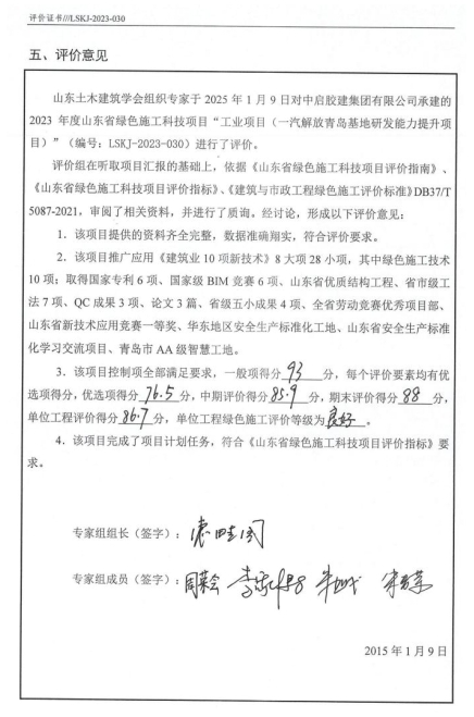 山東省綠色施工科技項目評價,是由山東土木建筑學會組織開展,旨在貫徹落實國家綠色發展理念,提高工程建設綠色施工水平,推進全生命周期綠色建造,推動實現碳達峰、碳中和,從而促進工程建設行業高質量發展。通過專家評審,該項目單位工程評價取得86.7分的優異成績,單位工程綠色施工評價等級為良好。