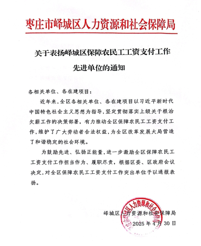 公司堅定貫徹落實上級關于根治欠薪工作的決策部署,由華東分公司承建的棗莊市嶧城區人民醫院項目在保障農民工工資支付工作中擔當作為,履職盡責。棗莊市嶧城區人力資源和社會保障局對公司進行了通報表揚,公司被評為嶧城區保障農民工工資支付工作先進單位。