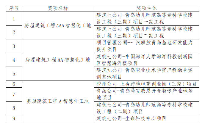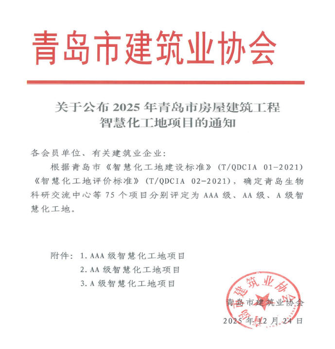 12月24日,青島市建筑業(yè)協(xié)會(huì)公布了青島市智慧化工地名單,中啟膠建集團(tuán)憑借在智慧化施工領(lǐng)域的創(chuàng)新實(shí)踐與突出成效,連續(xù)斬獲多項(xiàng)榮譽(yù),包括“房屋建筑工程AAA智慧化工地”、“房屋建筑工程AA智慧化工地”、“房屋建筑工程A智慧化工地”稱號(hào)。這一系列榮譽(yù)的獲得不僅彰顯了中啟膠建集團(tuán)在建筑施工智慧化轉(zhuǎn)型中的領(lǐng)先地位,也為青島建筑業(yè)高質(zhì)量發(fā)展提供了創(chuàng)新樣板。